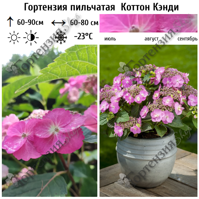 Гортензия пильчатая из серии ‘FLAIR & FLAVOURS’ Коттон Кэнди’ (Hydrangea serrata 'Flair Flavours Cotton Candy') в переводе ‘Сладкая вата’ – оправдывает свое название, повторно цветущая гортензия. Соблазнительная и сладкая,она ждет вас. Розовые, кружевные шапочки с желтой сердцевиной. И они цветут непрерывно, как на старых, так и на новых побегах, В зависимости от почвенных условий окраска цветков может также меняться на синюю. Его обрамляют темно-зеленые, зазубренные и красноватые листья. Достаточно компактный рост и высота 0,6 - 0,9 м позволяют выращивать его даже на небольших участках.