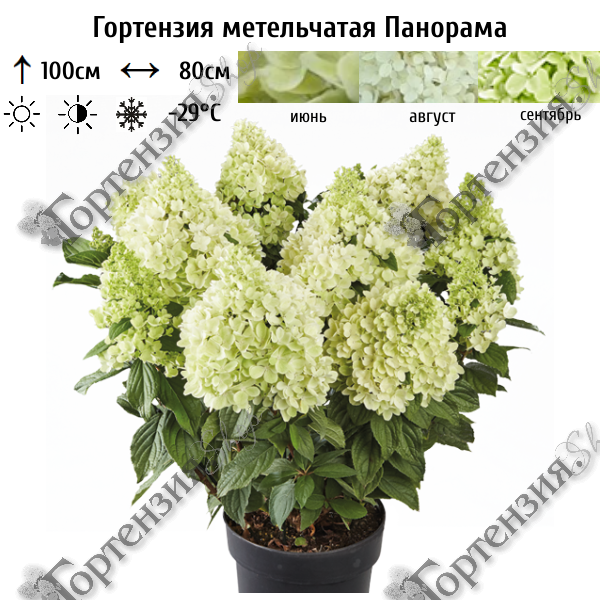 Гортензия метельчатая ‘Панорама’ - эксклюзивная серия патио немецкой селекции PAN – отличается невысокой, компактной формой куста, высотой до 100 см. Соцветия плотные, конусовидные, удивительной красоты и размера (до 40 см.), в начале цветения нежно-зелёного цвета, затем белые, к осени приобретают лаймовый оттенок, придавая саду атмосферу нежности и изысканности. Сорт практически не требуют формировки и обрезки, рано зацветает и обильно цветет с июня и до заморозков, неприхотлив в уходе. На солнечном участке или в легкой полутени цветение будет пышнее и ярче. Гортензии присущ нежный, ненавязчивый аромат.