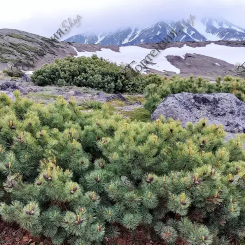 Кедровый стланик (Pinus pumila) - малорослое, кедровое, стелящееся хвойное деревце до 7 м высотой (в средне полосе 2-3 м) с компактной, густой, чашевидной, распростёртой или ажурной кроной. Корневая система поверхностная, на рыхлых грунтах стержневая, на мшистых коврах и при песчаных заносах образует придаточные корни от ветвей, что способствует редкой живучести стланика. Древесина тяжёлая, сильно смолистая, свилеватая. Кедровый стланец – чрезвычайно ветроустойчивая порода, лучшая для создания живых изгородей в северных регионах. Молодые побеги с рыжим опушением, прирост до 20 см/год, почки очень смолистые, хорошо защищённые от мороза. Хвоя гранёная, сизо-зелёная, часто с голубым отливом, длиной до 8 см, как у всех северных кедров и мягких сосен собрана в пучки-мутовочки по 5 штук. Женские шишечки пурпурно-фиолетовые, очень декоративные. У стланика шишка овальная, до 7 см длиной, тёмно-фиолетовая, при созревании коричневая. Как у всех кедров шишки зреют на второй год после опыления, а при созревании она опадает целиком с семенами, которых в шишке 35-40 штук. Плодоносит с 20-25 лет, ежегодно. Корни растут довольно необычно. Изначально у стелющегося стланика формируется основной корень и боковые корешки, но со временем центральный стержень отмирает и тогда дерево начинает усиленно наращивать боковые отростки, расположенные на поверхности. Они постепенно заглубляются в землю. На замену им растение выпускает придаточные корешки – их образуют ветки, касающиеся грунта. Способность выпускать придаточные корни и делает кедровый стланик таким крепким растением. Кедровый стланик растет на бедных и тяжелых почвах, на щебенчато-скалистых с незначительным плодородным слоем, на суглинистых и песчано-глинистых почвах подзолистого типа, на каменистых осыпях, на песках.