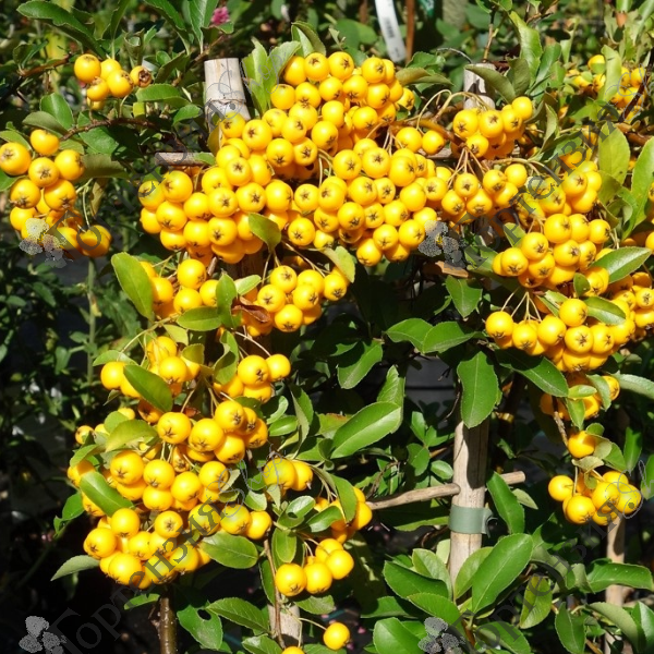 Пираканта – декоративно-растущий кустарник, который чрезвычайно ценится садоводами за обильное цветение и столь же красочное обильное плодоношение. Они красиво смотрятся в разнообразных композициях у стен зданий и солитером на газоне. Пираканты восхитительны в посадке отдельными кустами или же группами в виде живых изгородей. Солейл де Ор — быстрорастущее растение, которое за сезон может прибавить около 40 см. Плоды- это ягодки ярко-желтого цвета, которые в диаметре 6-8мм, собраны в соплодия, созревают в сентябре и держатся всю зиму, несъедобные.