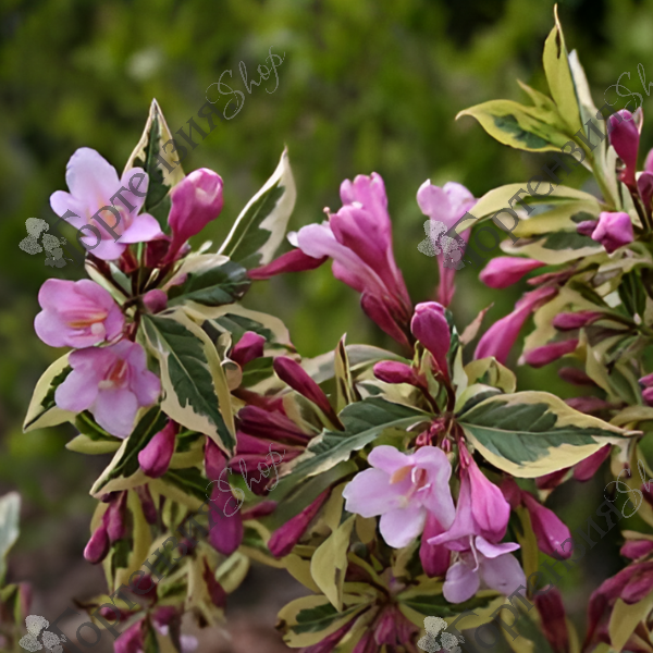 Вейгела цветущая Мэджикал Рэйнбоу (Weigela florida Magical Rainbow 'Kolmagira')– раскидистый кустарник с пестрой листвой. Разветвленный куст вырастает до 1,2 м. Основной зеленый тон листьев смешивается с золотистым окаймлением, которое со временем краснеет, листва не выгорает на солнце. В июне начинается обильное цветение, появляются соцветия из нежно-розовых трубчатых колокольчиков. Пестрота сохраняется в течение всего сезона. Вейгела Magical Rainbow любит солнце или полутень и влажную плодородную почву. Лучше сажать в местах, защищенных от ветра, а на зиму укрыть. Морозостойкость до -30С.