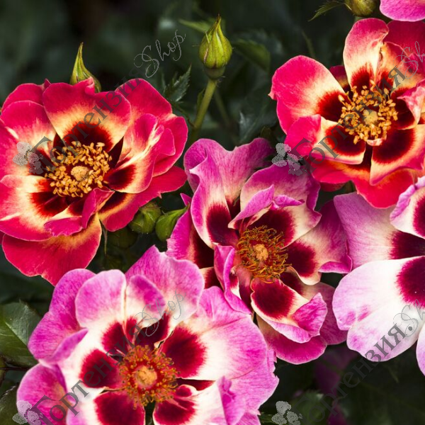 Роза миниатюрная Blushing Babylon Eyes - компактный куст высотой 50-70 см. Цветки диаметром 6 см, простые (4-8 лепестков), розовые с жёлтым гало вокруг тёмно-красного пятна в основании лепестков. Тональность цветков в процессе цветения меняется. Цветение обильное, повторное в течение сезона. Листва устойчивая к заболеваниям. Рекомендуется как бордюрная, контейнерная или балконная роза.