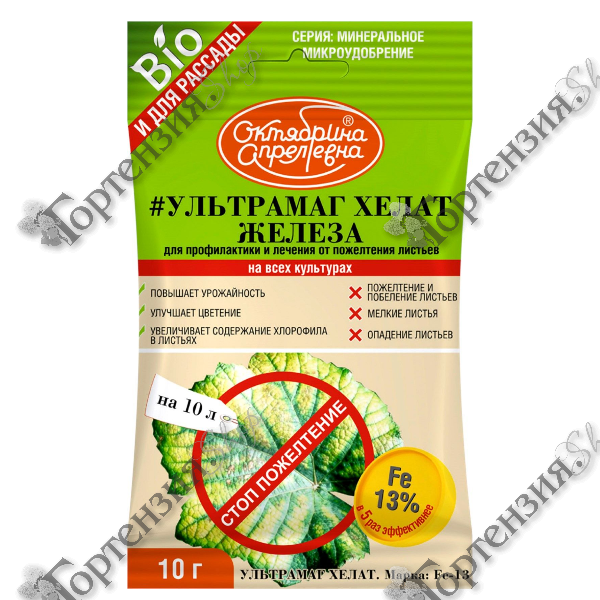 Ультрамаг с хелатом железа минеральное удобрение в легкоусваиваемой для растений форме, улучшает цветение, увеличивает содержание хлорофилла, повышает урожайность, предотвращает пожелтение, побеление и опадение листьев. Железо участвует в образовании хлорофилла которые участвуют в фотосинтезе и дыхании растения, активирует ферменты, участвует в синтезе белков и формовании цвета фруктов.
