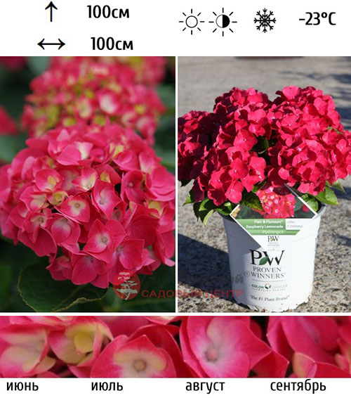 Гортензия Малиновый Лимонад из серии FLAIR&FLAVOURS® – выносливая и обильно цветущая гортензия с крепкими ветвями и красивыми полными шаровидными соцветиями малиново-красного цвета с желтой серединкой. Малиновый Лимонад от природы имеет очень компактную форму и очень здоровые глянцевые листья, что является огромным преимуществом для выращивания в горшках. Цветет все лето, на прошлогодних и новых ветвях. Для поддержания декоративности необходимо удалять отцветшие соцветия. Высота и ширина куста: 80 и 100 см. Растения крепкие и компактные, цветочные шапки очень плотные, крупные. Куст пышный с крупными зелеными листьями высотой до 80 см. Морозостойкость: высокая до -25°C. Однако требует укрытия на зиму, чтобы не замерзли почки цветов.